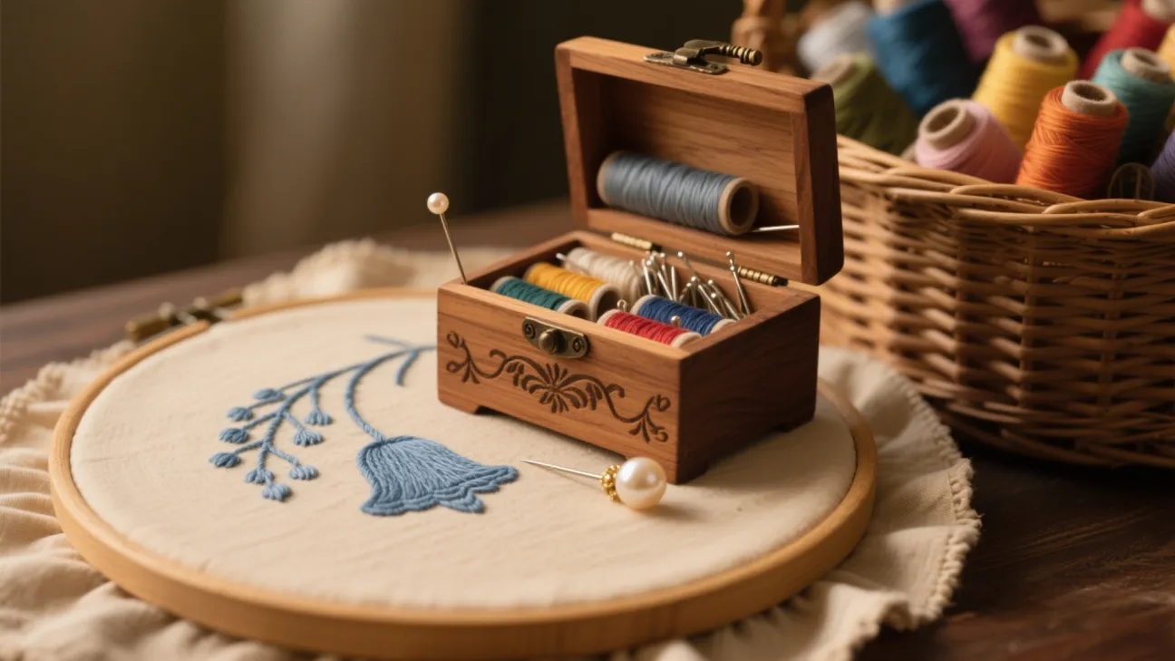Sada ručních šicích jehel v dřevěném pouzdře, není třeba navlékat nit
